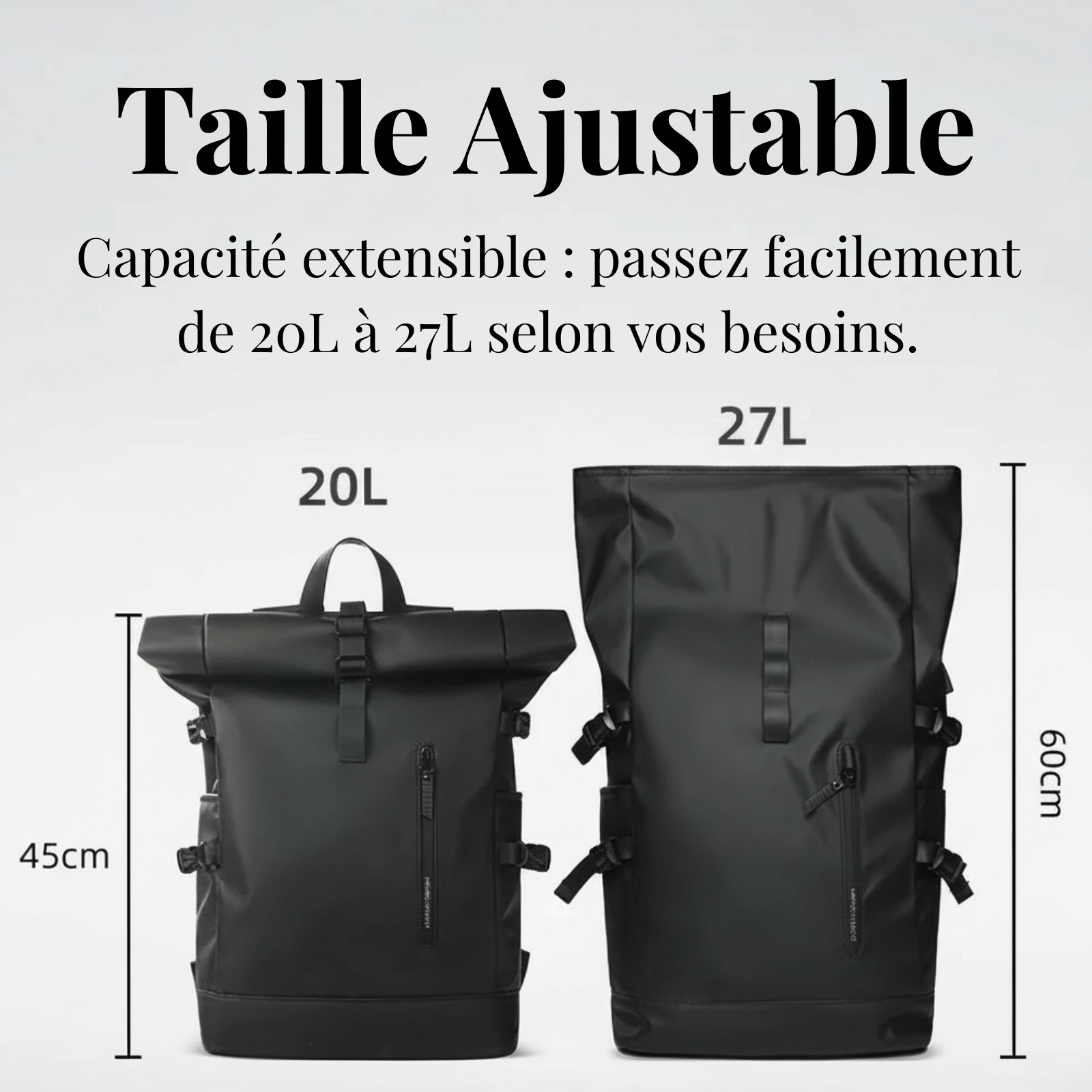 ↬ Capacité modulable 20L / 27L : sac pliable et extensible